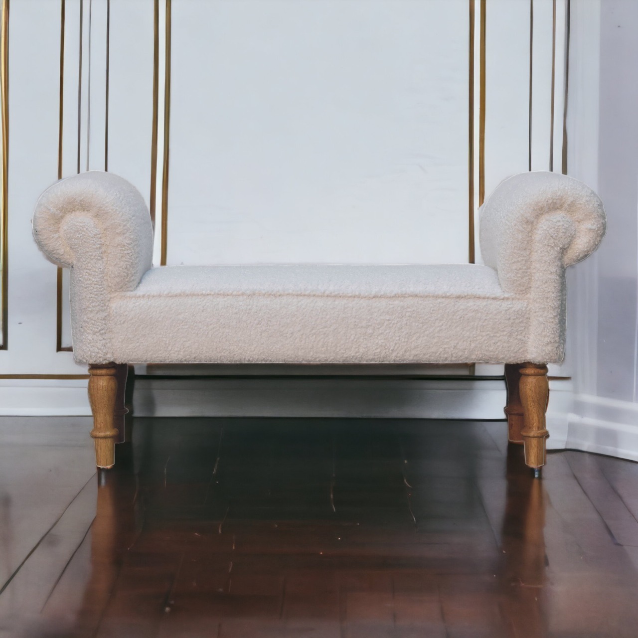 Care Instructions: Maintaining the White Boucle Bedroom Bench is straightforward. The boucle fabric can be gently vacuumed or brushed with a soft brush to remove dust and debris. For any spills or stains, a mild detergent and a clean cloth should suffice. Avoid harsh cleaners or vigorous scrubbing, as they could damage the fabric. The wooden legs can be dusted with a dry cloth and periodically treated with wood conditioner to maintain their luster.
