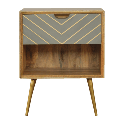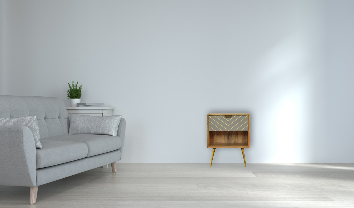This bedside has been inspired by a clean and modern finish design. It has been constructed from 100% solid mango wood in an oak-ish finish and its main feature is the grey cement drawer front with a beautiful golden brass inlay and 4 gold Nordic style feet which compliment the wooden body perfectly. It has 1 drawer for storing any bits and pieces before bedtime and an open slot for placing any books or magazines for quick access. It can be partnered with the other pieces from the collection or stand graciously alone.