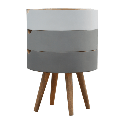 Add a unique and contemporary touch to your home with this bedside. Featuring 3 cylindrical grey hand painted drawers this piece is different to the other bedsides that we offer as the drawers can be stacked in different orders for a different style. It also has cut out slots for easy access and 4 nordic styles legs constructed from 100% solid mango wood in an oak-ish finish.
