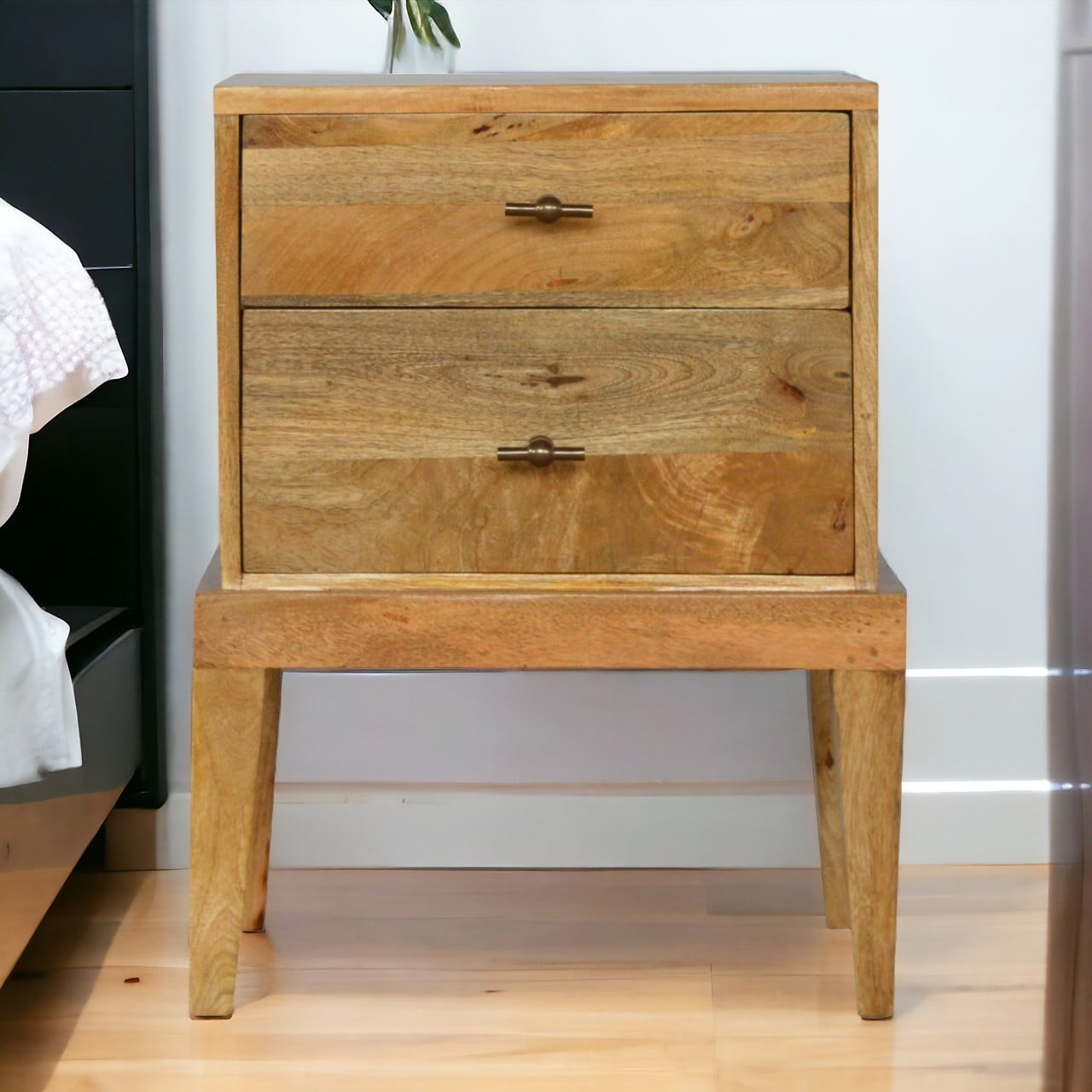 Elevate your interior design with the impeccable blend of sophistication and practicality—the Solid Wood Bedside with T-Bar Knobs. This 2-drawer bedside table seamlessly combines clean lines and a minimalist aesthetic, making it an essential addition to any bedroom setup. Drawing on Nordic influences, with its raised platform base and chic legs, this bedside table is not just furniture; it’s a statement of style and functionality.