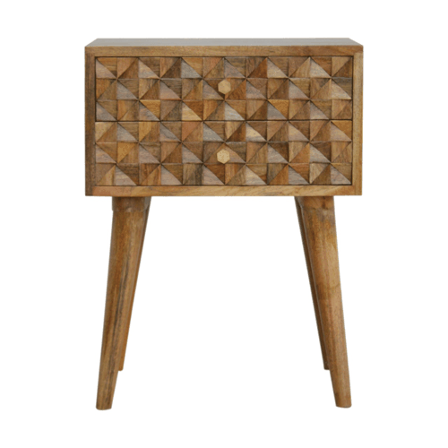 Perfectly constructed from 100% solid mango wood, this bedside marvel features an oak-ish finish that exudes warmth and tranquility, resonating with any color scheme and décor preference. The stand-out carved cube drawer fronts instantly catch the eye, marking the collection as a distinctive choice for discerning homeowners. Each of these exquisite two drawers comes complete with shiny brass knobs that offer a luxurious touch to the tactile experience of opening and closing the compartments.