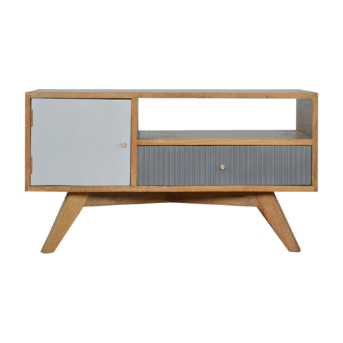 This divine media unit has been constructed from 100% solid mango wood with an oak-ish finish body and grey painted drawer fronts which include candle knobs for easy access to and from the drawers. This modern and simple piece would compliment any living room and is ideal for compact city homes.