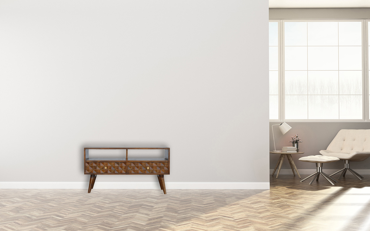Standing majestically on four Scandinavian-inspired legs, the Chestnut Diamond Carved TV Unit offers a contemporary touch with a nod to mid-century modern aesthetics. These legs not only provide unwavering stability but also grant an airy, spacious feel that seamlessly blends with various decor themes, from the minimalistic and sleek to the bold and rustic.
