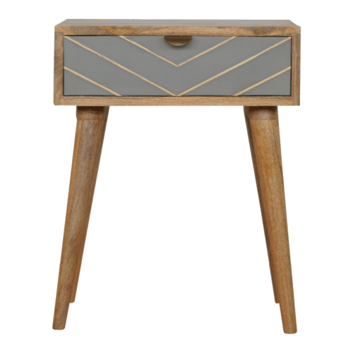 Constructed from the highest quality 100% solid mango wood, and finished with a subtle oak-ish hue, this piece encapsulates durability with a warm, natural appeal. The minimalist design is brought to life with a dazzling grey cement drawer front, embellished with a mesmerizing golden brass inlay that captures the eye and elevates the overall look of the bedside.