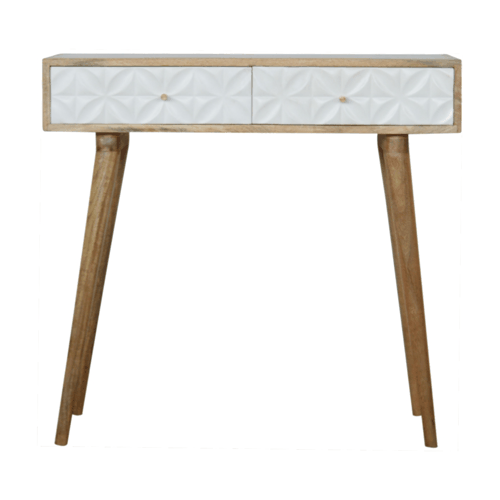 This beautiful console table has been constructed from 100% solid mango wood in an oak-ish finish with unique diamond hand carved drawer fronts that have been hand painted white. It features 4 Nordic style legs and two deep drawers to take care of everyday utility items. This console table will prove handy in your living room or hallway.