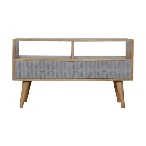 Add this lovely media unit to your living room. It features a beautiful carved design on the drawer front and has been constructed from 100% solid mango wood in an oak-ish finish with grey painted drawer fronts. It offers 2 open slots which will come handy when storing or dispaying any bits.