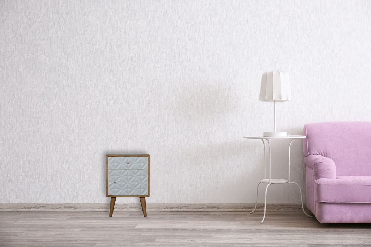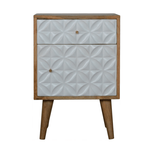 This stunning diamond hand carved bedside table will add a stylish and contemporary vibe to your home. Constructed from 100% solid mango wood in an oak-ish finish it features 2 white hand painted drawer fronts and stands on 4 Nordic style legs, a great statement piece for the bedroom.