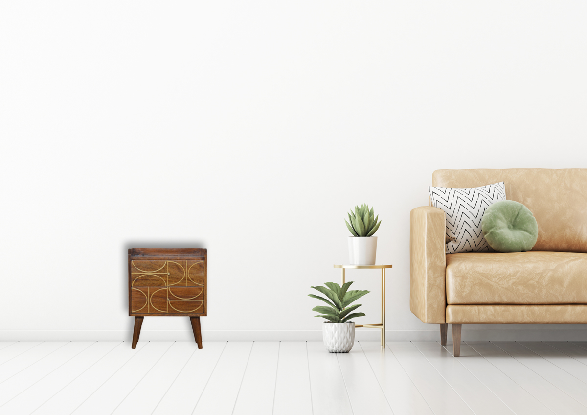 Meticulously crafted from 100% solid mango wood, this bedside furnishing radiates an exquisite chestnut finish that provides a sumptuous, warm ambiance to any sleeping quarters. The wood’s rich, deep tones are accentuated by the golden brass abstract inlay on the drawer fronts, which capture and reflect light, bringing a touch of glamour and luxury to the room’s atmosphere.