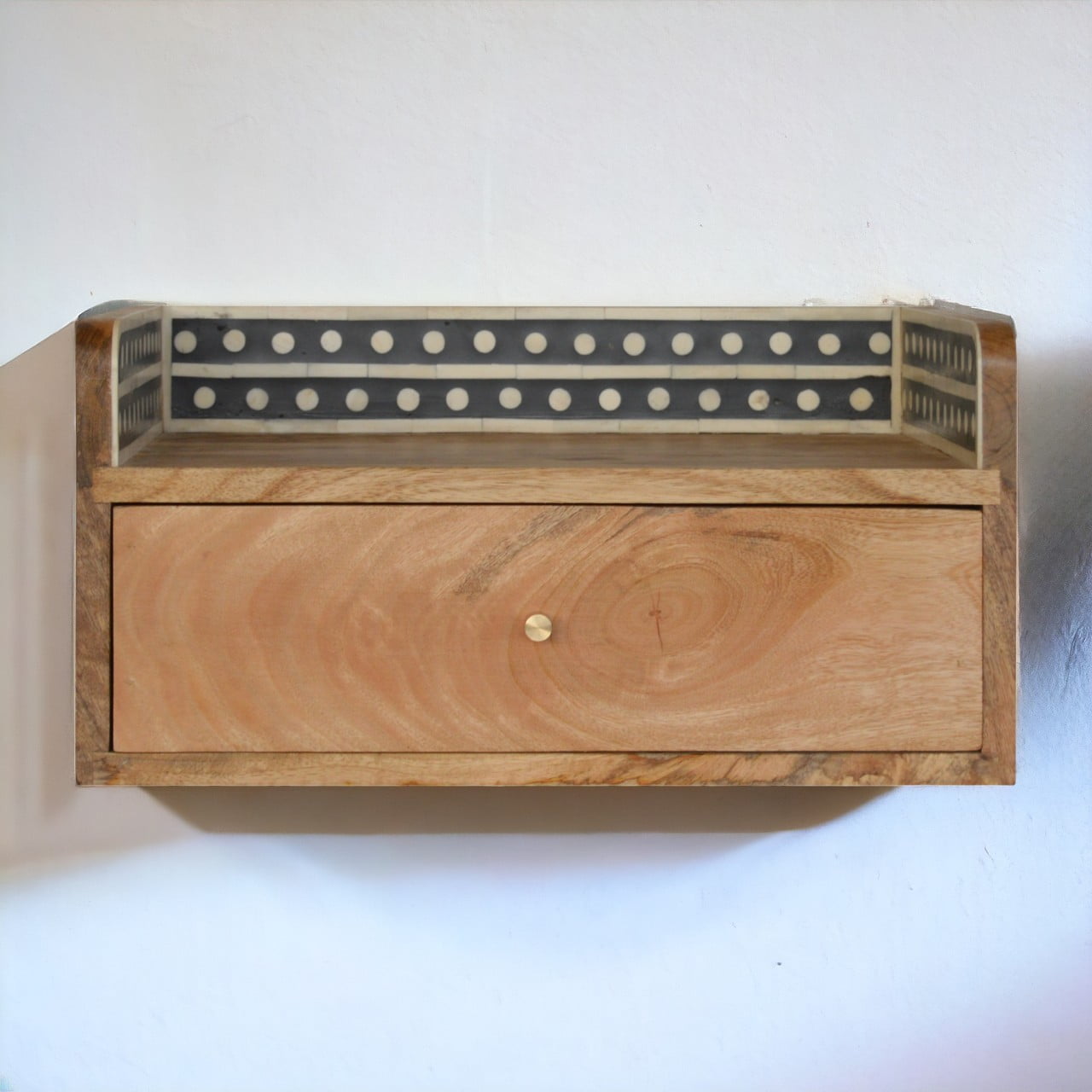 Welcome to a new era of bedroom elegance and sophistication with our Bone Inlay Gallery Floating Bedside—a wall-mounted haven of style and functionality that brings a classic yet contemporary charm to your personal space. This impeccably designed unit is not only a testament to the timeless beauty of solid mango wood but also an ode to meticulous craftsmanship manifested through an intricate bone inlay gallery back.
