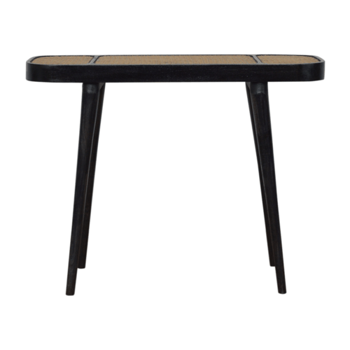 Experience the perfect blend of elegance and practicality with the Larissa Carbon Black Console Table, a stylish statement piece designed to enrich your home with a touch of sophistication and ample functionality. Crafted meticulously from 100% solid mango wood, this table’s striking ash black finish paired with a hand-woven rattan top offers a distinctive flair that effortlessly complements various decor themes. Whether it graces your bedroom, lights up your hallway, or adds finesse to your living room, this console table is the quintessential choice for showcasing your favorite decorative items like vases, photo frames, and more.