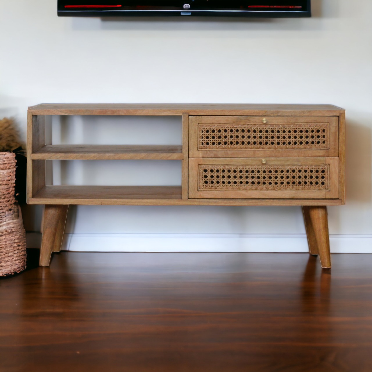 The Larrisa Media Unit combines traditional craftsmanship with contemporary design elements, featuring two rattan front drawers that are not only sturdy but also provide a refreshing contrast with their intricate woven texture. These drawers offer ample space to tuck away your entertainment essentials, from remote controls and gaming accessories to magazines and albums.