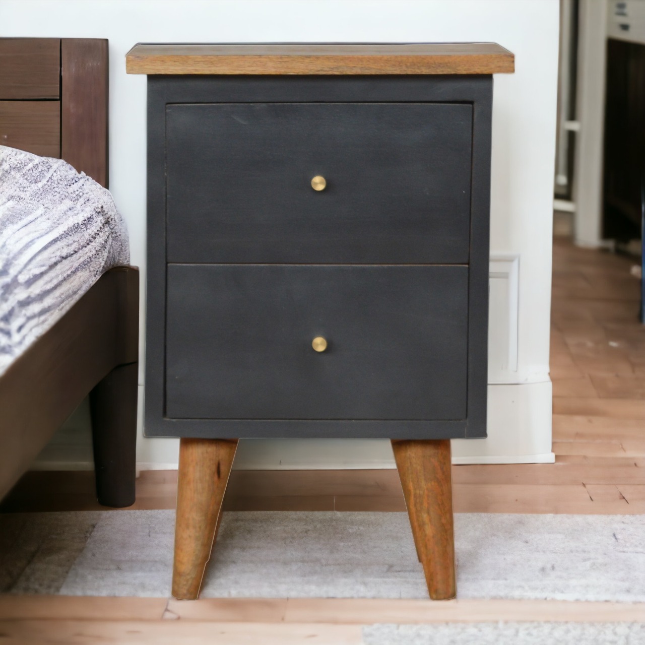 Transform your bedroom into a haven of contemporary elegance with the Charcoal Black Hand Painted Bedside Table. Masterfully constructed from 100% solid mango wood, this bedside table serves not only as a functional piece but also as a statement of style and craftsmanship. The oak-like finish on the top and legs contrasts beautifully with the hand-painted charcoal black body, creating a sophisticated yet inviting look that complements various interior styles, from rustic to modern.