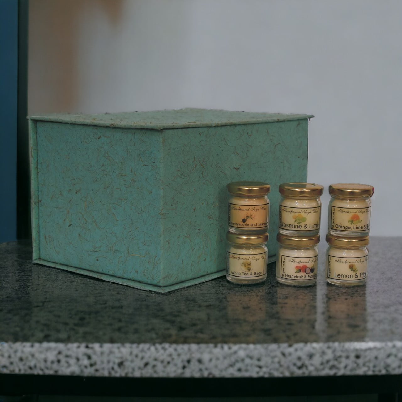 Set the mood with our mini candles, made to be used in any room of the home, especially suited for the living room, bedroom or bathroom. This cute set of 6 comes with a wonderful selection of Honeysuckle & Jasmine, Jasmine & Lime, Orange, Lime & Basil, White Tea & Sage, Grapefruit & Mangosteen and Lemon & Pine scented candles. Light and enjoy.