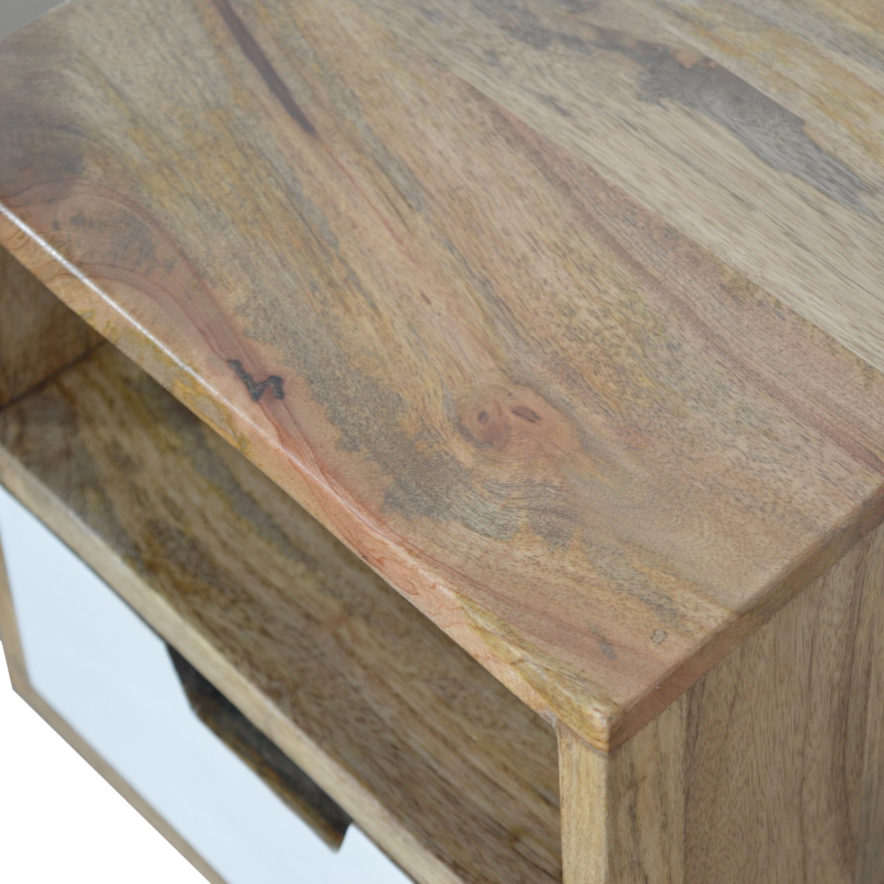The Mini White Hand Painted Bedside Table showcases exceptional craftsmanship and innovative design. The table features a fine oak-like finish that enhances the rich, natural grain of the mango wood, adding a touch of rustic elegance to your space. Its compact size is perfect for any bedroom, offering a beautiful storage solution without overwhelming the room.