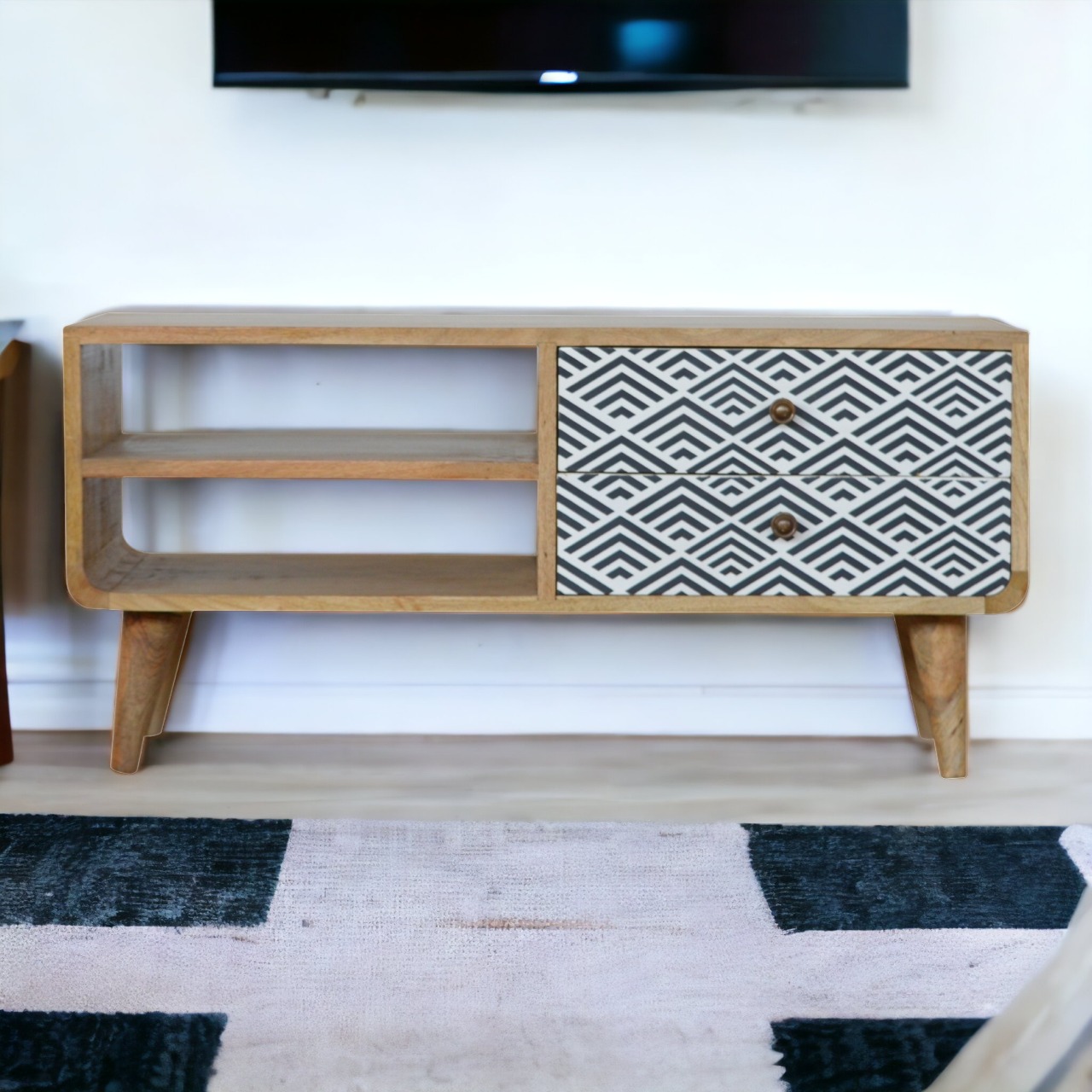The most striking feature of this media unit lies in its screen-printed drawer fronts, a monochrome masterpiece that delivers a stark, delightful contrast against the natural hue of the mango wood. The intricacy of the print is not merely a design—it’s a narrative, a modern brushstroke on a classic canvas, making each unit a unique conversation piece in your abode.