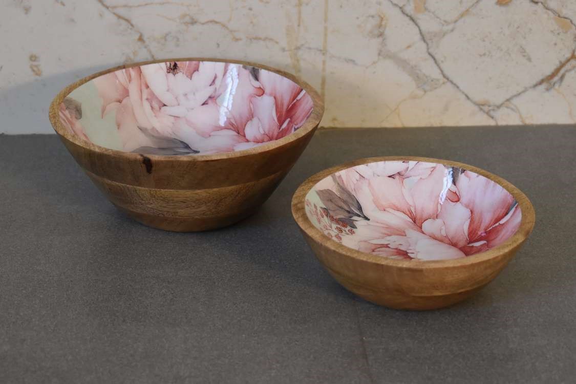 The natural grain of Mango Wood on the outside brings a rustic yet sophisticated aesthetic, which effortlessly complements the delicate pink floral designs inside. Each bowl in this set is handcrafted individually, making every piece unique. The distinctive differences in finish, texture, and size are a testament to the artisanal craftsmanship involved in creating this beautiful set. Far from being considered defects, these variations enhance the charm and uniqueness of each bowl, proving that true beauty lies in individuality.