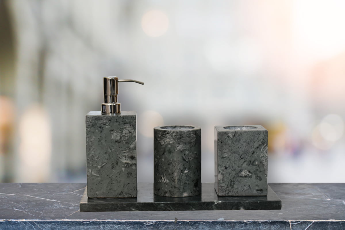 Handmade Indian furniture showcases the exquisite craftsmanship of local artisans. Each piece of our Green Marble Bathroom Set is crafted with traditional techniques and local materials, supporting the skilled workmanship of these artists while delivering a piece that is functional, beautiful, and rich in cultural artistry. The individual touches and unique nuances of each accessory highlight India’s rich heritage and the artisans’ dedication to their timeless craft.