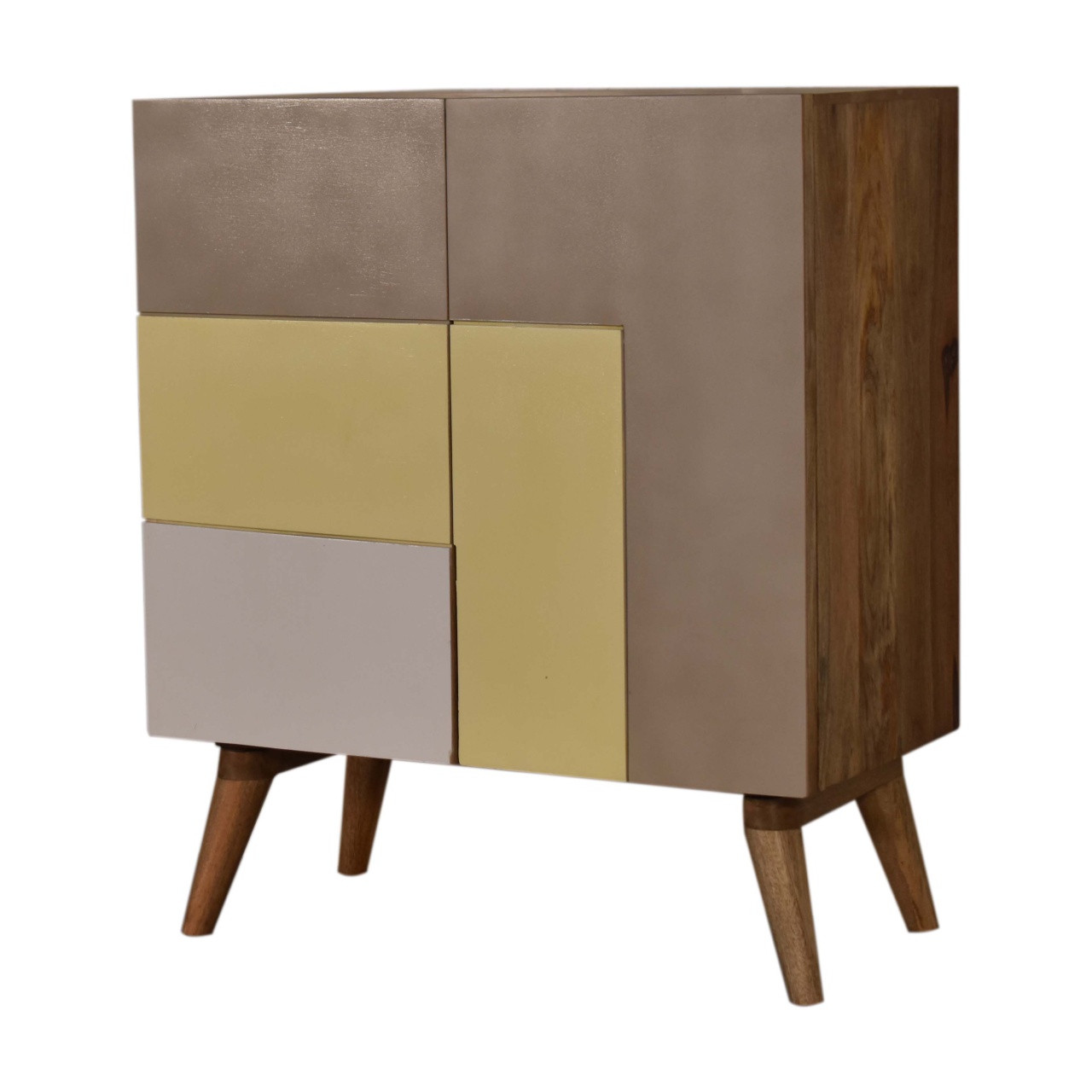 Crafted with precision and care, the Quebec Yellow Cabinet boasts a structure composed of 100% solid mango wood. This eco-conscious choice of material not only ensures durability and quality but also resonates with those who appreciate sustainability and environmentally responsible craftsmanship. With its sturdy composition and natural warmth, mango wood provides a solid foundation for the hand-painted finish that graces the exterior in three bold shades of yellow. The L pattern design is a testament to the attention to detail that goes into every stroke, ensuring that this piece is not only furniture but also a form of vibrant art.