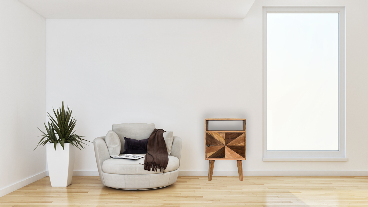 A beautiful addition to your bedroom, this Safi Bedside Table features a contemporary, stylish design. Finished with a unique mixed wood door front this piece will look smart in almost any decorating scheme. It is constructed from 100% solid mango wood and also features an open slot, a shiny brass knob and nordic style legs.