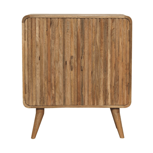 Elevate your living space with the T-bar Ridged Cabinet, a perfect blend of mid-century modern design and functional elegance. This captivating piece of furniture, meticulously crafted from 100% solid mango wood, combines style and practicality. Its natural oak finish exudes a warm, inviting charm that complements any interior decor, from contemporary to classic.