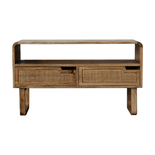 Crafted with attention to detail, the Tallin Media Unit features an open slot ideal for housing your entertainment systems, books, or decorative elements, providing easy access and display options. The two spacious rattan drawers not only add a touch of texture and warmth to the unit but also offer ample storage space to keep your living area clutter-free. With thoughtfully designed cut-outs, you can seamlessly access the drawers without compromising the unit’s sleek profile.