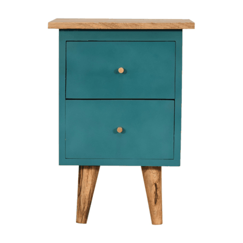 The bedside table exudes rustic charm with an oak-ish finish top and legs that contrast wonderfully with its vibrant, hand-painted teal body. This inviting hue, carefully applied by skilled artisans, breathes life and personality into the room, ensuring your space feels warm and embracing.