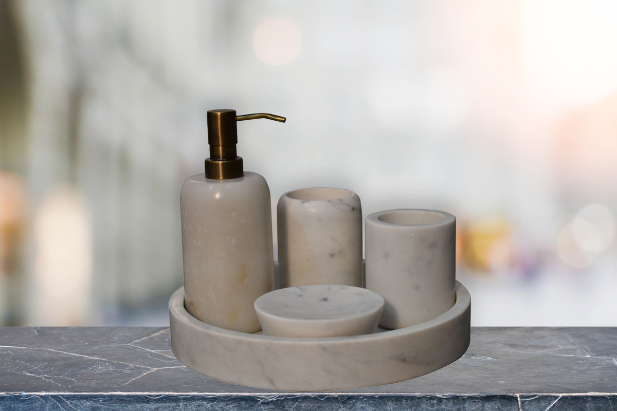 This bathroom set serves not only as a suite of accessories for your own use but also stands out as a distinctive gift choice for someone who appreciates the finer things in life. The splendor of these pieces lies in their individuality; expect delightful variations in texture, color, and grain, as each is carved from a unique block of marble. This diversity is a mark of authenticity and should not be seen as a flaw but embraced as a testament to the natural beauty and origin of the materials.