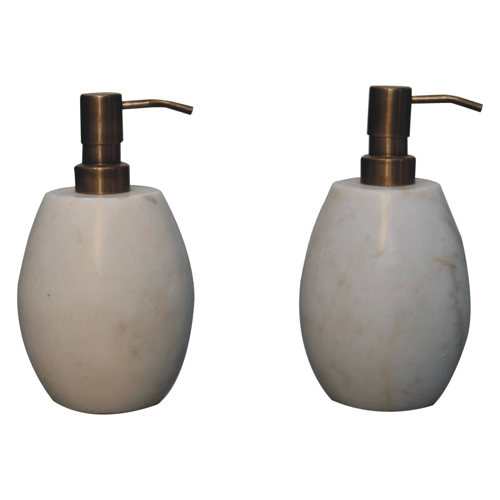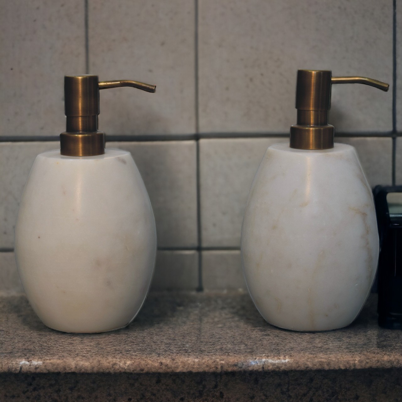 Each dispenser is crafted from polished white marble, showcasing the stone’s natural beauty in its unique texture and grain variation. This inherent uniqueness means no two pieces are alike, offering you a truly custom addition to your home. The smooth, rounded design is complemented by sleek metallic pump tops, offering both durability and ease of use, ensuring your bathroom remains a sanctuary of style.
