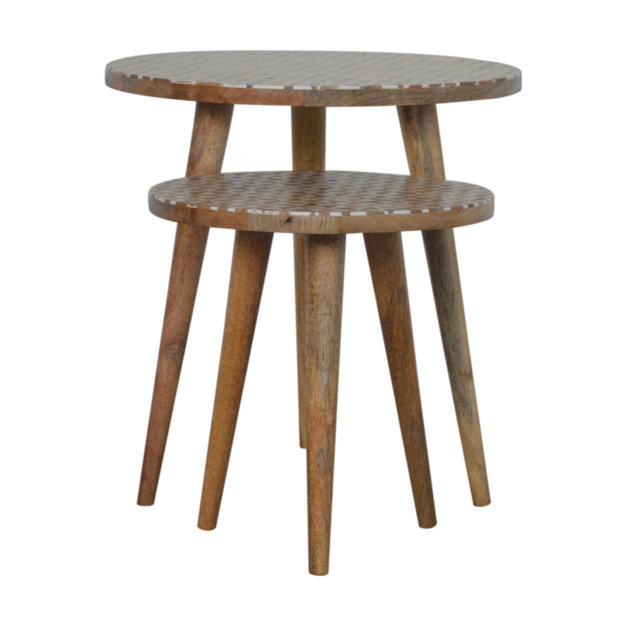 From the inviting texture of the wood grain to the intricate white pattern adorning the surface, every element of these stools reflects superior artistry and thoughtful design. Their polished appearance is sure to make a statement, enhancing the ambiance of your living room, bedroom, or hallway.
