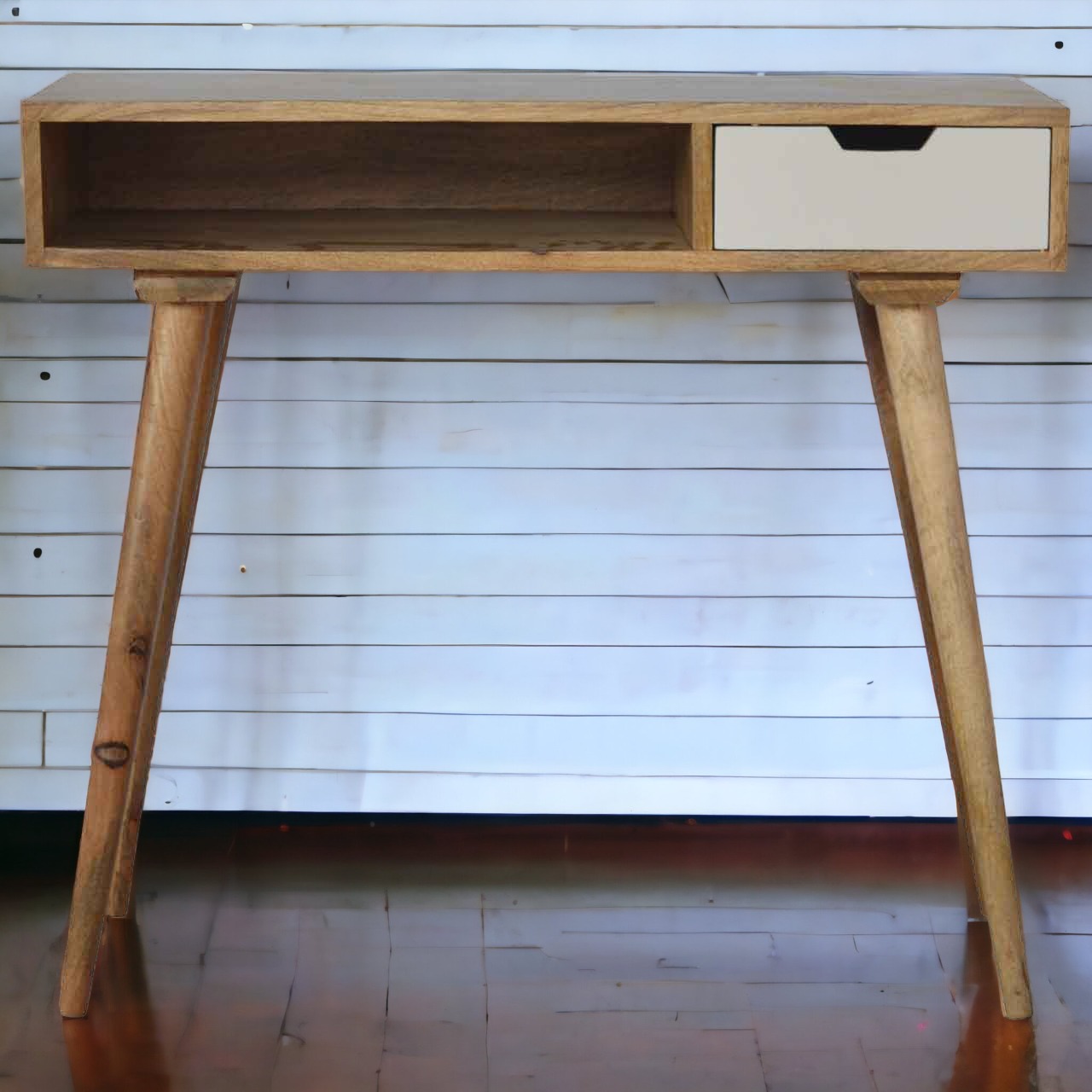 The desk flaunts a natural oak finish that highlights the rich grain of mango wood, emanating a warm and inviting appeal. The fine wood finish is lovingly complemented by a hand-painted white drawer, featuring a sleek cutout handle that adds a touch of contemporary flair to its classic design. The spacious tabletop provides ample room for your laptop, documents, and other work essentials, while the open shelf beneath offers a perfect nook for storing books, pens, or other office supplies.